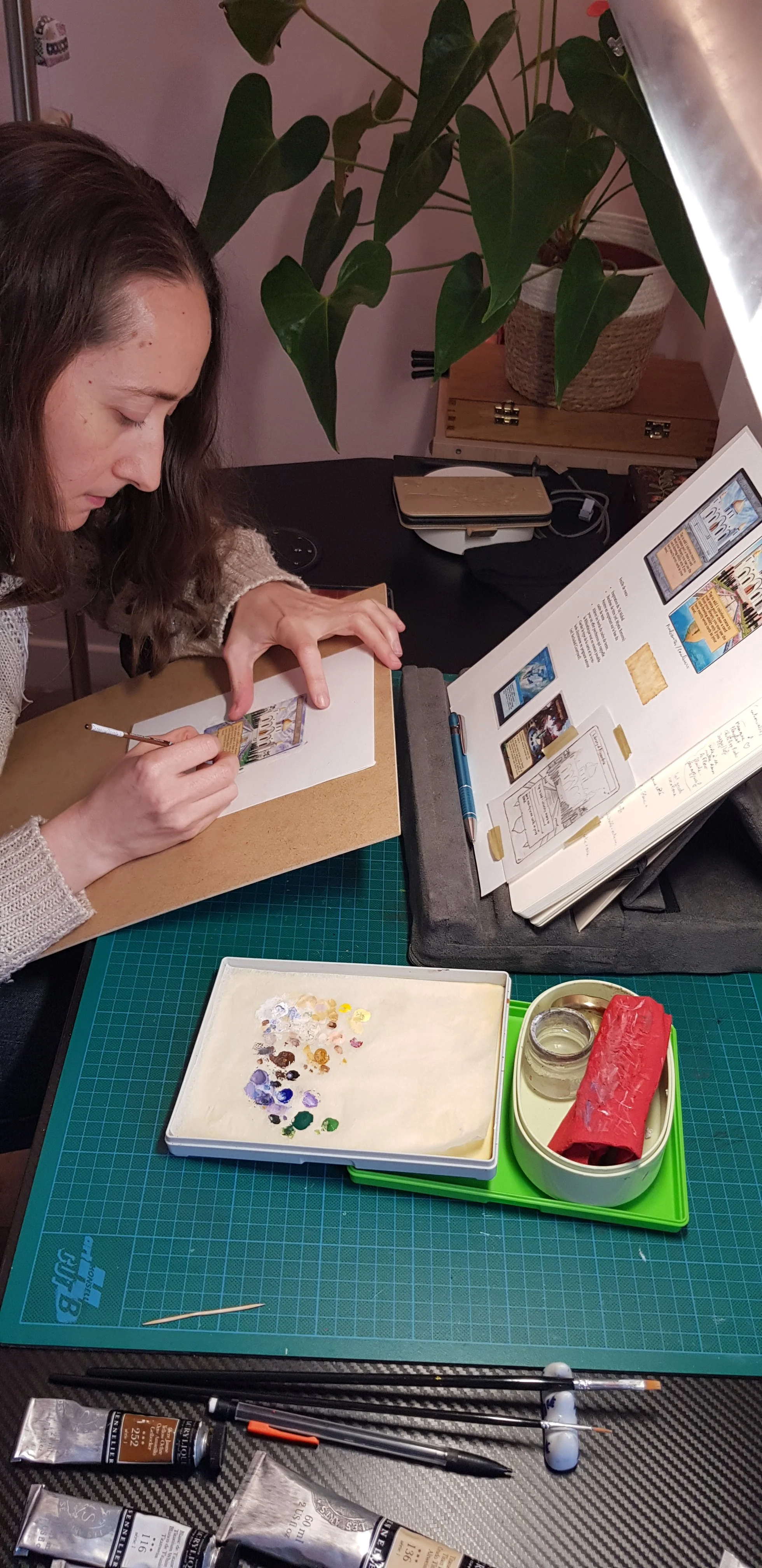 Avant de commencer, j'ai coupé toutes les distractions. Musique douce, classique. Les premières touches ont été les plus difficiles — j'y suis allée à tâtons, en cherchant mes repères sur ce terrain que je ne connaissais pas encore. Puis progressivement la carte s'est transformée sous le pinceau. J'ai fini par prendre possession de mon espace de peinture et par composer vraiment avec l'illustration originale.